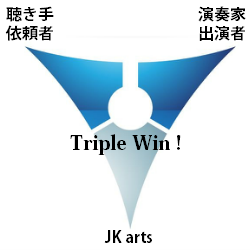 その観点からJK artsでの事業は、「(Win-Winならぬ)Triple-Winの関係を生み出すこと」を念頭において展開して参ります。つまり関係するすべての方々が幸せになれること、たとえばコンサート企画でいえば「聴きに来た方々」「演奏者」がそれぞれ「良かった」と思えて、かつ私自身もそう思えるように、コンサート録画・録音でいえば 「依頼した方」「出演された方々」、そして私自身が「良かった」と思えるように。